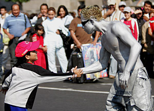 | 在墨西哥首都墨西哥城街頭,一名藝人跟游客進(jìn)行互動表演。墨西哥城有許多藝人在街頭表演,豐富了市民的娛樂生活。新華社記者