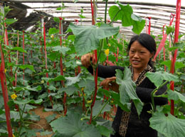 江西樂平市鎮(zhèn)橋鎮(zhèn)百樂村菜農(nóng)王淑琴喜看長勢良好的小黃瓜。 近年來,江西省樂平市鎮(zhèn)橋鎮(zhèn)在冬暖式大棚蔬菜生產(chǎn)的基礎(chǔ)上,擴大產(chǎn)銷規(guī)模,2007年該鎮(zhèn)與臺灣吳太港發(fā)展促進會宏茂果蔬食品加工廠聯(lián)姻發(fā)展小黃瓜、缸豆等“訂單蔬菜”生產(chǎn),種一畝黃瓜為菜農(nóng)提供預(yù)付定金、支架、種子、肥料等款計400元左右。菜農(nóng)種植的“訂單蔬菜”將通過當?shù)爻闪⒌内M臺蔬菜加工廠加工后銷往臺灣和東南亞地區(qū)。 |