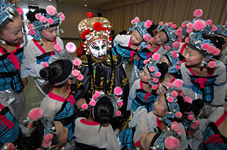 圖為2008年6月14日,參加“婺劇變臉”演出的大小演員在一起準備表演。 當日是我國第三個文化遺產(chǎn)日,杭州市舉辦浙江省暨杭州市文化遺產(chǎn)日系列活動;顒訃@非物質(zhì)文化遺產(chǎn)保護,舉辦舞臺演出、實物展覽、圖片展示等活動。新華社記者