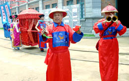 6月26日,沈陽關(guān)東影視城的演藝人員在表演“王府娶親”民俗節(jié)目。集中再現(xiàn)沈陽上個(gè)世紀(jì)20年代到30年代北市場(chǎng)市井民風(fēng)的關(guān)東影視城,日前對(duì)中外游客開放。這個(gè)影視城坐落在棋盤山國際風(fēng)景旅游開發(fā)區(qū)內(nèi),總建筑面積約3.8萬平方米,擁有各式建筑177棟。北市場(chǎng)原名“十間房”,是近代工商業(yè)興起、手工作坊向近代輕工業(yè)轉(zhuǎn)變及百姓市井文化的縮影。當(dāng)年,與北京天橋、天津勸業(yè)場(chǎng)、上海城隍廟等齊名。 |