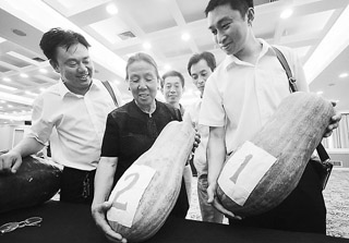 圖為岳龍芳(左二)抱著22斤重的“蜜本南瓜王”熱情地向參加推介會的群眾介紹無公害蜜本南瓜的優(yōu)點。