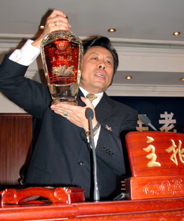 2004年7月一瓶釀?dòng)?00年前的五糧液以50萬元被拍賣。新華社記者:周俏春 攝