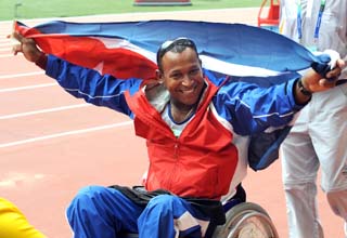 9月8日,古巴選手萊昂納多·迪亞斯在比賽后身披國(guó)旗慶祝奪冠。當(dāng)日,萊昂納多·迪亞斯在北京2008年殘奧會(huì)男子鐵餅F55/56級(jí)決賽中,以40米87的成績(jī)獲得冠軍。