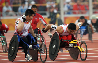 9月9日,中國選手張立新(左)與隊(duì)友李虎召在比賽中交接。當(dāng)日,在國家體育場進(jìn)行的北京2008年殘奧會男子4X100米接力T53/T54級決賽中,中國隊(duì)以49秒90的成績奪冠。