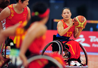 9月9日,中國隊(duì)球員劉咪換(右一)在比賽中控球。當(dāng)日,在國家體育館舉行的北京2008年殘奧會輪椅籃球女子B組預(yù)賽中,中國隊(duì)以53比37戰(zhàn)勝墨西哥隊(duì)。