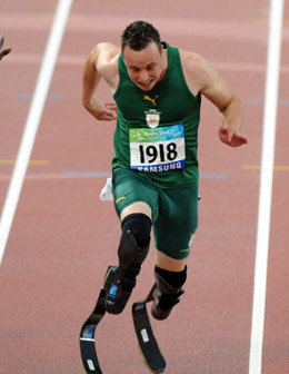 9月9日,南非選手皮斯托瑞斯在比賽中沖過終點(diǎn)。當(dāng)日,在國家體育場進(jìn)行的北京2008年殘奧會男子100米T44級決賽中,有“刀鋒戰(zhàn)士”之稱的南非著名殘疾人運(yùn)動員皮斯托瑞斯以11秒17的成績奪得冠軍。