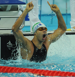 9月9日,巴西選手布拉西爾在獲勝后慶祝。當(dāng)日,在北京2008年殘奧會S10級男子100米自由泳決賽中,巴西選手安德烈·布拉西爾以51秒38的成績打破世界紀(jì)錄并獲得冠軍。