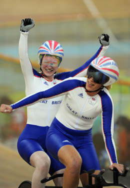 9月9日,英國選手麥格林(左)和領(lǐng)騎員亨特在比賽后慶祝勝利。當(dāng)日,在老山自行車館舉行的北京2008年殘奧會場地自行車女子個人追逐賽(B&VI)中,麥格林和亨特以3分39秒809的成績奪得冠軍。
