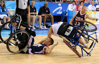 輪椅籃球隊(duì)員摔倒后又奮力起身繼續(xù)投入比賽的那一刻,他們的拼搏精神都會贏得觀眾經(jīng)久不息的掌聲。新華社記者:李紫恒 攝