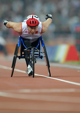 攝 | “我天生就喜歡速度的感覺(jué),那種在奔跑中風(fēng)從耳邊掠過(guò)的快感……” 雖然不幸因病截去了一條腿,但以輪椅為“戰(zhàn)車(chē)”的張立新,終于在北京殘奧會(huì)上實(shí)現(xiàn)了他從小的追風(fēng)夢(mèng)想。 14日晚6點(diǎn)半,鳥(niǎo)巢。男子4X400米T53-54級(jí)輪椅競(jìng)速接力賽,中國(guó)四員“飛車(chē)虎將”張立新、崔彥鋒、趙驥、李虎召以3分5秒67奪得冠軍,并且刷新了由他們?cè)谏衔鐒倓倓?chuàng)造的世界紀(jì)錄。當(dāng)最后一棒的張立新像風(fēng)一樣刮到終點(diǎn)時(shí),他已經(jīng)超出第二名足足有四十米遠(yuǎn)。 這是張立新第四次“站”在最高領(lǐng)獎(jiǎng)臺(tái)上,注視著國(guó)旗從眼前升起。在他參加的集體和單人共4個(gè)項(xiàng)目比賽中,全部摘下金牌! “他太讓人難以置信了,在賽場(chǎng)上他簡(jiǎn)直就是‘野獸’。”這是在14日男子200米T54級(jí)決賽后,和他同場(chǎng)競(jìng)技的前殘奧會(huì)冠軍、芬蘭名將泰赫蒂對(duì)張立新的評(píng)價(jià)。 能取得今天的驕人成績(jī),張立新在賽后最想感謝的人除了媽媽外,就是他的恩師——前國(guó)家輪椅競(jìng)速隊(duì)總教練田海江!斑@個(gè)月30號(hào)是田導(dǎo)去世一周年的日子,如果時(shí)間安排允許,我想去他的老家湖北武漢祭奠一下。田導(dǎo)生前最大的愿望就是在北京奧運(yùn)會(huì)上帶著我們奪取金牌。” “他直到臨走動(dòng)手術(shù)前還在給我們寫(xiě)訓(xùn)練計(jì)劃。”去年備戰(zhàn)全國(guó)殘運(yùn)會(huì)的時(shí)候,田海江被查出胰腺癌晚期,三個(gè)月后過(guò)世。 帶著幫恩師實(shí)現(xiàn)遺愿的雄心,在本屆殘奧會(huì)上,張立新一次次地帶給大家驚喜!霸瓉(lái)想拿到一塊金牌就很高興了,沒(méi)想到越戰(zhàn)越勇。” 8日上午,北京殘奧會(huì)田徑比賽在“鳥(niǎo)巢”揭幕,張立新在男子400米T54級(jí)第一輪的比賽中,就打破殘奧會(huì)紀(jì)錄。 9日,張立新和隊(duì)友合力獲得男子4X100米接力T53-54級(jí)金牌。 10日,在男子400米T54級(jí)的決賽中,張立新一路領(lǐng)先斬獲冠軍,同時(shí)以45秒07的成績(jī)創(chuàng)造了新的世界紀(jì)錄。 14日上午,男子200米T54級(jí)決賽中,張立新以24秒34的成績(jī)奪冠。他在預(yù)賽中以24秒18的成績(jī)創(chuàng)下了新的世界紀(jì)錄。 14日晚上,男子4X400米接力T53-54級(jí)決賽,張立新和三名隊(duì)友用金牌和破世界紀(jì)錄的成績(jī)?yōu)樽约旱谋本垔W之旅完美收官。 身高1米80,長(zhǎng)得陽(yáng)光帥氣的張立新從小喜歡運(yùn)動(dòng),在學(xué)校時(shí)是校足球隊(duì)的主力前鋒。后來(lái),因?yàn)楣侨饬霾坏貌唤厝ヒ粭l腿,但這并沒(méi)有毀掉張立新的體育之路。此后,張立新打過(guò)一段時(shí)間的輪椅籃球,但當(dāng)他第一次看到輪椅競(jìng)速比賽時(shí),場(chǎng)上風(fēng)馳電掣的場(chǎng)面再次點(diǎn)燃了他心中的追風(fēng)夢(mèng)想。 輪椅競(jìng)速的訓(xùn)練枯燥、艱苦。張立新介紹說(shuō),輪椅的操控主要來(lái)自雙手的快速摩擦,就算是戴著皮手套,同樣會(huì)帶來(lái)?yè)p傷。在賽后接受采訪時(shí),張立新把雙手伸到記者面前說(shuō):“你們看,兩只手都練得變型了,骨節(jié)都比較大! 同時(shí),運(yùn)動(dòng)員參加比賽所用的輪椅并不好控制,“我們的重心都在后面,控制不好就會(huì)側(cè)翻,尤其是在下雨的時(shí)候。”張立新就曾在一次訓(xùn)練中因?yàn)閭?cè)翻而摔成腦震蕩。“直到現(xiàn)在,累的時(shí)候還會(huì)有點(diǎn)頭疼,”他說(shuō)。 雖然付出了巨大的努力,但張立新成長(zhǎng)的道路也并非一帆風(fēng)順。四年前的雅典殘奧會(huì),張立新僅僅獲得一個(gè)第六名。 從雅典的第六到北京殘奧會(huì)獲得四金,張立新付出了太多的努力。這里面也包含了田海江教練的精心調(diào)教!八牢覀儦埣踩诉\(yùn)動(dòng)員需要什么,也知道怎么管理和訓(xùn)練我們,這是他最獨(dú)特的地方! 梅花香自苦寒來(lái)。日復(fù)一日的苦練,讓張立新逐漸躋身世界頂級(jí)選手的行列。他和隊(duì)友一起,獲得了世錦賽、亞運(yùn)會(huì)的冠軍,但他最希望的,還是能在北京奪冠。 張立新最終實(shí)現(xiàn)了他的夢(mèng)想,他的下一個(gè)目標(biāo)在四年后的倫敦。