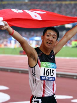 9月15日,中國香港選手蘇樺偉在比賽后慶祝勝利。當(dāng)日,在國家體育場進(jìn)行的北京2008年殘奧會男子200米T36級決賽中,蘇樺偉以24秒65的成績奪冠,并打破世界紀(jì)錄。