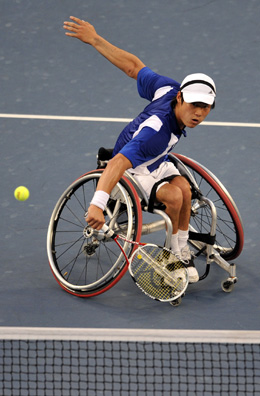 9月15日,日本選手國枝慎吾在比賽中回球。當(dāng)日,在北京2008年殘奧會輪椅網(wǎng)球男子單打公開級決賽中,國枝慎吾以2比0戰(zhàn)勝荷蘭選手羅賓·阿梅爾蘭,奪得冠軍。