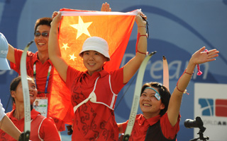 9月15日,中國選手高芳霞(中)、符洪芝(左一)、蕭彥紅(右一)慶祝勝利。當(dāng)日,在北京2008年殘奧會女子團(tuán)體反曲弓-公開級決賽中,中國隊?wèi)?zhàn)勝韓國隊,獲得金牌。