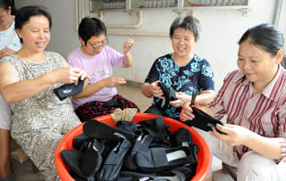 江西贛州市章貢區(qū)渡口路社區(qū)是贛州市集中安置老弱特困殘人員的首個廉租房社區(qū)。2007年來,社區(qū)以“解決就業(yè)與再就業(yè)、扶貧幫困”為宗旨,創(chuàng)辦了社區(qū)“和諧創(chuàng)業(yè)社”,從生產(chǎn)廠家以訂單形式接回串燈泡、打火機組裝、信封加工、組裝電子元件以及鞝鞋底等十幾個手工制作項目,讓社區(qū)居民足不出戶實現(xiàn)就業(yè)。9月19日,渡口路社區(qū)困難戶龔冬英(右一)等在樓道口鞝鞋底。 |