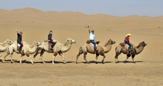 10月2日,游客在騰格里沙漠騎駱駝?dòng)瓮。新華社記者:李欣