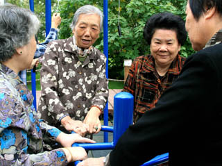 據(jù)上海市質(zhì)協(xié)用戶評價中心10月6日發(fā)布的調(diào)查報告顯示,上海老年人生活幸福指數(shù)為77.17%,處于較滿意水平。同時,高達(dá)79.8%的老人更樂意在家庭中養(yǎng)老,但有近4成獨住老人的子女不常回家看望父母,影響了老人們的生活質(zhì)量滿意度。圖為幾位老人在上海一居民小區(qū)的健身園內(nèi)活動筋骨。