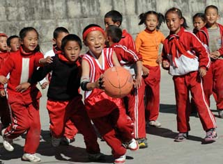 云南省迪慶藏族自治州德欽縣地處云南和西藏的交界地帶,海拔3400多米。近年來當(dāng)?shù)氐拿褡褰逃聵I(yè)蓬勃發(fā)展,藏族孩子的入學(xué)率達到99%以上,切實保障了適齡兒童受教育的權(quán)利。從2007年起,德欽縣還實施了“藏區(qū)高原農(nóng)牧民子女學(xué)生生活補助工程”,讓當(dāng)?shù)厣先f名農(nóng)牧民孩子受益。如今藏族孩子們坐在寬敞明亮的教室里接受現(xiàn)代文明的教育,一天天地茁壯成長。 云南省迪慶藏族自治州德欽縣示范小學(xué)的學(xué)生正在打籃球。 |