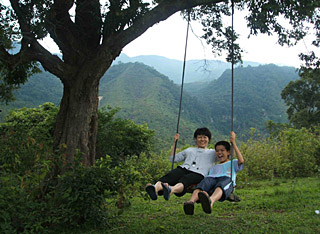 | 參加“探險游”的一對母子在海南鸚歌嶺山腳下蕩秋千。新華社發(fā)(彭桐