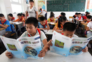 正在舉行的上海市第十三屆人大常委會(huì)第六次會(huì)議上傳出消息,從2008年開(kāi)始,上海實(shí)施義務(wù)教育不僅不收學(xué)費(fèi)和雜費(fèi),同時(shí)也不再收取教科書費(fèi)和作業(yè)本費(fèi),這一舉措將寫入地方法規(guī)。會(huì)議審議了《上海市實(shí)施〈中華人民共和國(guó)義務(wù)教育法〉辦法(修訂草案)》,其中第五條在國(guó)家規(guī)定不收學(xué)費(fèi)和雜費(fèi)的基礎(chǔ)上,增加了免收教科書費(fèi)、作業(yè)本費(fèi)的內(nèi)容。 圖為上海市普陀區(qū)曹楊小學(xué)的學(xué)生們正在上課。 |