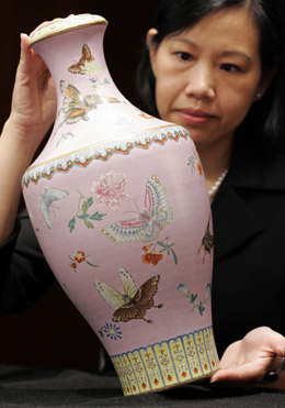 清乾隆御制粉紅地粉彩軋道蝴蝶瓶。新華社記者:呂小煒 攝