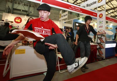 12月4日,2008中國國際食品及酒店設備用品博覽會在上海新國際博覽中心開幕,來自美國、英國、日本、新加坡等25個國家和地區(qū)的近750家食品企業(yè)參展。本屆展會的展出面積達8000平方米,展出了各國風味的食品、飲料,參觀者在大飽眼福的同時也能免費品嘗各種美味。圖為一名廚師正在展會現(xiàn)場制作比薩。