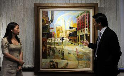 佳士得拍賣行的工作人員在秋拍前介紹畫家朱沅芷的作品《歡樂節(jié)慶的百老匯》。新華社記者:呂小煒