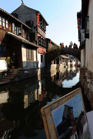 一名美術(shù)愛好者剛完成的寫生畫與周莊美景相映成趣。本報記者:楊磊 攝 |