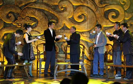 1月4日,在北京舉行的電影《赤壁》(下)首映式上,演員趙薇(左二)、金城武(左三)、梁朝偉(右三)等部分電影主創(chuàng)人員向?qū)а輩怯钌?中)敬茶。新華社發(fā)(韓源 攝)