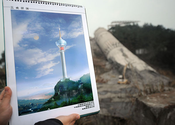 圖左為“三峽明珠觀光塔”效果圖,圖右為“三峽明珠觀光塔”廢墟。本報(bào)記者
