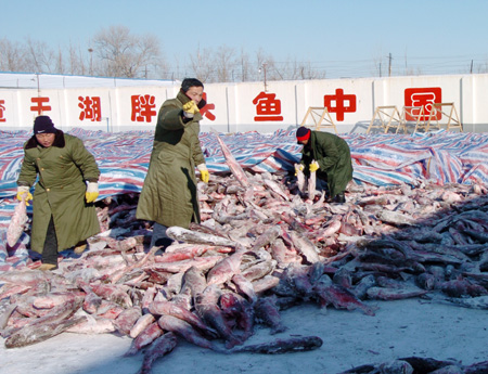 14日,吉林省查干湖漁場(chǎng)到庫房里里擺滿了剛剛捕上來到魚,很多游客驅(qū)車到這里購買鮮魚。數(shù)九隆冬,吉林省查干湖又迎來了冬季捕魚的黃金時(shí)節(jié)。隨著當(dāng)?shù)芈糜螛I(yè)的發(fā)展,查干湖漁業(yè)資源也得到有效開發(fā),很多游人頂風(fēng)冒雪跑到冰冷的湖面上爭(zhēng)睹萬魚躍網(wǎng)的壯觀場(chǎng)面。日前,吉林省查干湖冬捕以單網(wǎng)出魚量16.8萬公斤,打破了2006年創(chuàng)下的10.45萬公斤的單網(wǎng)產(chǎn)量的世界紀(jì)錄,創(chuàng)造了新的單網(wǎng)冰下捕撈量最高的吉尼斯世界紀(jì)錄。 14日,查干湖漁場(chǎng)職工正在為鮮魚分類。 |