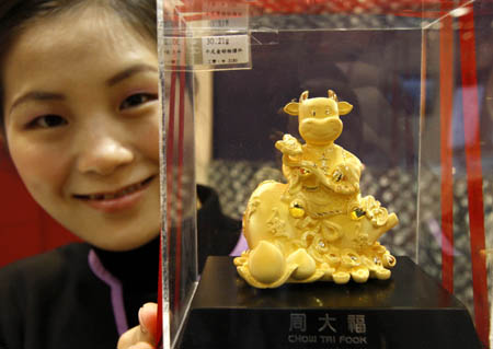 1月19日,廣西南寧一家商場(chǎng)的工作人員在展示一款“金!憋椘。 隨著農(nóng)歷牛年的臨近,各類牛黃金飾品紛紛面市。一款款栩栩如生、憨態(tài)可掬的“金!笔艿奖姸嘞M(fèi)者的青睞。