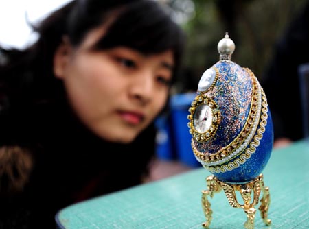 春節(jié)期間,中國(guó)科學(xué)院武漢植物園推出系列民俗活動(dòng),游客在武漢植物園里除了能欣賞奇花異草外,還能觀賞剪紙、面塑等傳統(tǒng)的手工藝以及新穎的蛋雕工藝品,一些游客在驚嘆這些精雕細(xì)刻的工藝品同時(shí),還購(gòu)買(mǎi)一些手工藝品回家收藏。圖為一位女孩被鵝蛋制作的首飾盒吸引。
