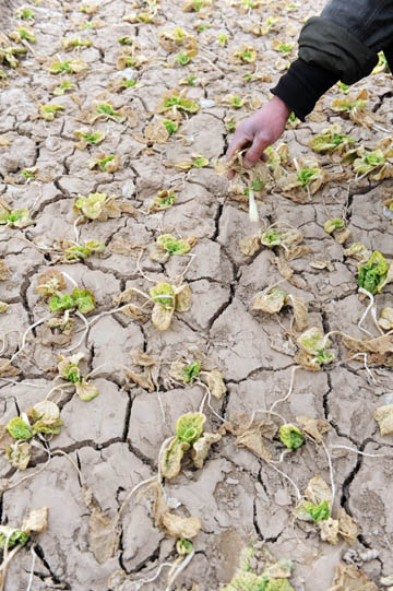 入冬以來我國北方地區(qū)遭遇嚴(yán)重干旱。據(jù)農(nóng)業(yè)部統(tǒng)計(jì),河南省近六成的麥田受旱,有360多萬畝出現(xiàn)黃苗,有40多萬畝出現(xiàn)枯苗死苗現(xiàn)象;安徽省近七成的麥田受旱,有90萬畝出現(xiàn)點(diǎn)片死苗現(xiàn)象;山東、山西、陜西、甘肅等省麥田受旱面積均超過一半。