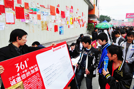 泉州晉江陳埭鎮(zhèn)溪邊烏橋頭招工現(xiàn)場(chǎng),外來工觀望者居多。2008年下半年以來,民營經(jīng)濟(jì)發(fā)展迅速的福建省泉州市經(jīng)受住金融危機(jī)沖擊,未出現(xiàn)大量企業(yè)倒閉、工人失業(yè)、農(nóng)民工提前返鄉(xiāng)現(xiàn)象,全市150多萬外來工穩(wěn)定就業(yè)。熟練工人、普工、技術(shù)人員成為受企業(yè)青睞對(duì)象。