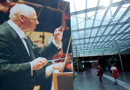 2月13日,觀眾從國(guó)家大劇院水下走廊懸掛的指揮大師海丁克的招貼畫(huà)旁走過(guò)。13日當(dāng)晚,海丁克和芝加哥交響樂(lè)團(tuán)把80分鐘的馬勒第六交響曲一氣呵成地在國(guó)家大劇院現(xiàn)場(chǎng)演奏。