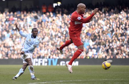 2008/2009賽季英格蘭超級(jí)聯(lián)賽第25輪,曼城隊(duì)主場(chǎng)1:0力克米德?tīng)査贡り?duì)。圖為曼城隊(duì)球員肖·菲利普斯(左)起腳射門(mén)瞬間。
