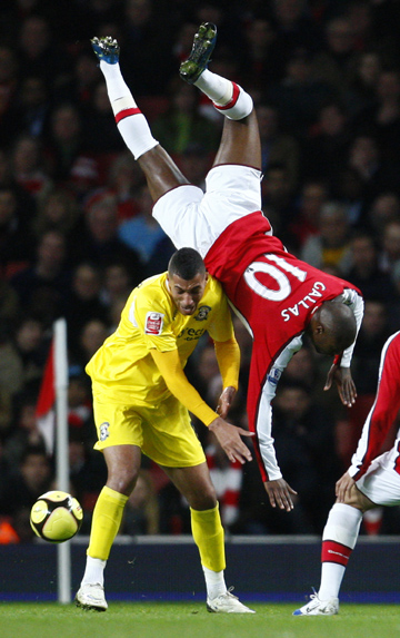在英格蘭足總杯的一場(chǎng)比賽中,阿森納隊(duì)球員加拉斯(右)與加的夫城隊(duì)球員拼搶。