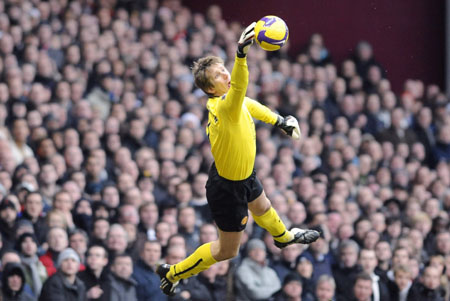 2008/2009賽季英超聯(lián)賽第25輪,曼聯(lián)隊(duì)客場(chǎng)以1比0戰(zhàn)勝西漢姆隊(duì)。圖為曼聯(lián)隊(duì)守門(mén)員范德薩在比賽中撲救。