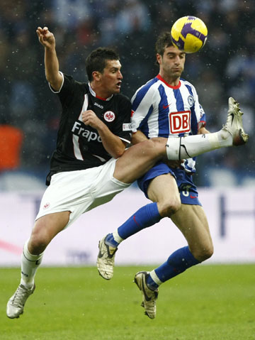 德國(guó)足球甲級(jí)聯(lián)賽第18輪比賽,柏林赫塔隊(duì)球員尼庫(kù)(右)與法蘭克福隊(duì)球員費(fèi)寧拼搶。