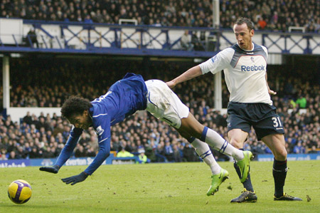 2008/2009賽季英格蘭超級(jí)聯(lián)賽第25輪,埃弗頓隊(duì)主場(chǎng)3:0完勝博爾頓隊(duì)。圖為博爾頓隊(duì)球員安·奧布里恩(右)在禁區(qū)對(duì)埃弗頓隊(duì)新租借球員約(Jo)犯規(guī)。 |