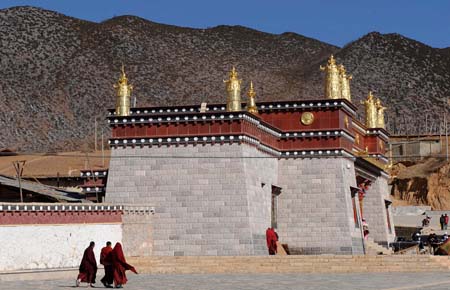 建于1679年的噶丹松贊林寺位于云南省迪慶藏族自治州香格里拉縣,是云南最大的藏傳佛教寺廟群落,有“小布達拉宮”的美譽。全寺占地面積達33萬平方米,屬于省級重點文物保護單位。近年來當?shù)卣坝嘘P(guān)部門先后投入近兩億元資金對噶丹松贊林寺進行保護和修繕。目前該寺已經(jīng)成為迪慶州“旅游觀光、藏傳佛教文化展示”的核心景區(qū),每年吸引大批中外游客前來參觀。 這是幾名僧人在云南迪慶噶丹松贊林寺新建的寺門樓旁。