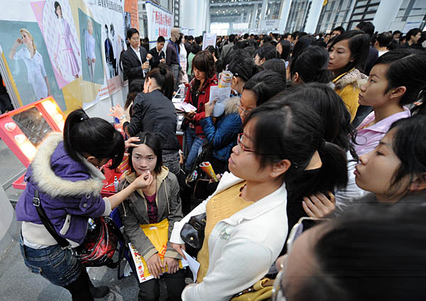 近日,“2009年春季廣西人才交流大會(huì)”在南寧市國(guó)際會(huì)展中心舉行,求職者除了要準(zhǔn)備好各種材料,也越來越重視個(gè)人形象。一些形象設(shè)計(jì)、服裝租賃、人才評(píng)價(jià)公司亮相人才交流會(huì),受到眾多求職者的追捧。圖為在廣西南寧市國(guó)際會(huì)展中心,一名求職者在體驗(yàn)免費(fèi)形象設(shè)計(jì)。