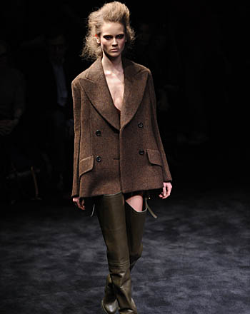 長筒靴 帶有拉鏈或吊襪帶的長筒靴出現(xiàn)在普拉達(dá)和羅伯托·卡瓦利在米蘭時裝周的T型臺上,今年秋冬這種款式的長筒靴將是女性衣櫥里必不可少的配備。 在普拉達(dá)的秀場上,模特們穿著長至大腿根部的皮靴,同樣材質(zhì)的吊襪帶一直連接到短裙或大衣外面的皮帶上。淺褐色、黑色或紅色的短靴也帶有到膝蓋以上的吊襪帶。 |