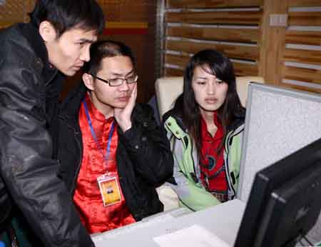 2008年1月23日,“山寨春晚”發(fā)起人、策劃人施孟奇(中)和組委會(huì)工作人員商討晚會(huì)事宜。(新華社資料照片) |