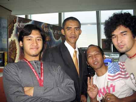 “山寨奧巴馬”印尼攝影師伊勒哈姆·阿納斯(左)裝扮成美國當(dāng)選總統(tǒng)奧巴馬的模樣與同事合影。新華社/路透 |