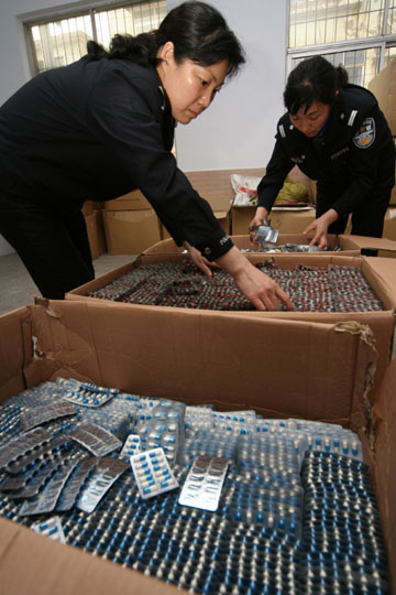 3月18日,河南省許昌市公安局魏都分局民警在涉嫌制造假藥的窩點統(tǒng)計查獲的假藥、標(biāo)簽、藥盒等。 當(dāng)日,魏都警方接群眾舉報,在市區(qū)向陽路一閑置廠房內(nèi)查獲一涉嫌制造假藥窩點,當(dāng)場查扣涉嫌假冒藥品10多種,半成品藥品、包裝箱、合格證、防偽標(biāo)識等1000多件,涉案金額達(dá)2000余萬元。據(jù)介紹,這些假藥用肉眼難以分辨,必須借助先進(jìn)儀器檢測。此案目前正在進(jìn)一步調(diào)查中。