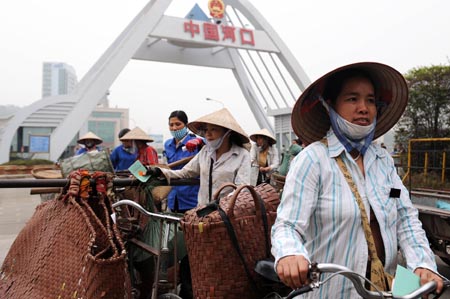 云南省近年來積極發(fā)展與越南的邊境貿(mào)易與經(jīng)濟合作,其中國家一類口岸云南河口邊境貿(mào)易十分活躍,每天有近萬名中越邊民進行貿(mào)易往來。2007年至2008年,河口口岸的進出口總值接近150億元。圖為越南邊民在河口口岸排隊等待進關。