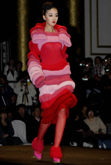 浙江理工大學(xué)2009屆畢業(yè)生設(shè)計(jì)作品發(fā)布會(huì)上展示的學(xué)生作品。 受國(guó)際金融危機(jī)影響,東京時(shí)裝周直接宣布取消活動(dòng),紐約、倫敦、米蘭等地的秋冬時(shí)裝周也縮減規(guī)模,而在北京舉行的中國(guó)國(guó)際時(shí)裝周則基本保持穩(wěn)定。一周時(shí)間里舉辦近40項(xiàng)專業(yè)活動(dòng)。在這近40項(xiàng)專業(yè)活動(dòng)中,關(guān)于學(xué)生作品的活動(dòng)占到1/3,成為本屆時(shí)裝周的亮點(diǎn)。 |