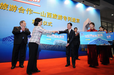 4月6日,北京市旅游局局長張慧光(前左)向山西太原旅游部門負(fù)責(zé)人交付北京新地標(biāo)建筑國家體育場“鳥巢”、國家游泳中心“水立方”以及國家大劇院等景點(diǎn)免費(fèi)門票的大票樣。 當(dāng)日,山西旅游專列抵達(dá)北京,北京市旅游局在北京西客站為620名游客舉行了簡短而熱烈的歡迎儀式。這是全國鐵路4月1日零時(shí)起開始實(shí)施新的列車運(yùn)行圖后,旅游區(qū)域合作出現(xiàn)的新舉措。有關(guān)人士認(rèn)為,國內(nèi)旅游隨著鐵路基礎(chǔ)設(shè)施的逐步完善,正在迎來“動車時(shí)代”。