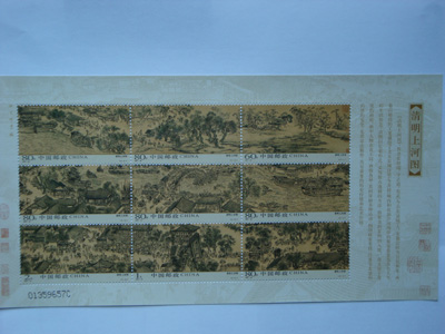 清明是我國的二十四節(jié)氣之一,也是我國的傳統(tǒng)節(jié)日之一,是拜祖和掃墓的日子。清明節(jié)又叫踏青節(jié)、寒食節(jié)。清明節(jié)始于周代,至今已有2500多年的歷史。2008年,國務(wù)院決定清明節(jié)為法定節(jié)日。 北宋時期,我國畫壇出現(xiàn)了一幅繪畫精品,它就是畫家張擇端創(chuàng)作的傳世之作《清明上河圖》,這幅畫畫幅浩大、藝術(shù)精湛,被人譽為“千古大觀、人間異寶”,現(xiàn)存北京故宮博物院。屬一級國寶。為了使這幅精品繪畫,讓更多的后人欣賞到,中國郵政在2004年10月18日將它搬上了方寸,發(fā)行《清明上河圖》郵票1套9枚(志號為2004-26) 《清明上河圖》原畫長528.7厘米,全畫自右至左,大體分為三個部分:其一是寧靜廣闊的鄉(xiāng)村、汴京郊外的春光;其二是繁忙的汴河漕運碼頭;其三是繁華的都城汴京城,熱鬧的市區(qū)街道一角(今河南開封)。畫面布局合理,有張有弛、有巰有密、有條有理、繁而不亂,充分展現(xiàn)了北京政和年間清明時節(jié)的一派繁榮升平景象。 這套郵票的設(shè)計和印刷很有特色,將5米多長的長卷壓縮在這套郵票中,惟一的辦法是選擇畫中的部分,以特寫鏡頭的手法,將郊野、漕運和城市選切入郵票中,然后有序的排在一個小全(版)張上,而中間部分也是全畫的高潮部分,水陸交通、城鄉(xiāng)溝通放在郵票的正中地位,起到一目了然、以小見大的效果,具有較高的設(shè)計與印刷水平。